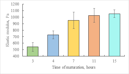 This method was used to study the maturation of the collagen sol-gel system. After the formation of the hydrogel from the sol at protein concentration 16 mg/mL during the initial 3 hours of the incubation at +37 °C, the average elastic modulus was 543 Pa (SD = 67 Pa) and increased to 951 Pa (SD = 126 Pa) upon standing in the closed container for the following 4 hours. After 15 hours, the value of the elastic modulus stabilized at 1053 Pa (SD = 60 Pa).